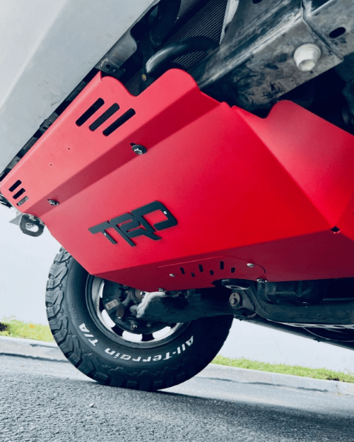 Custom Skid Plate Compatible with Tacoma 2005-2023 2WD & 4WD. Easy 15-minute installation, with oil filter access, Red with Black Letters.