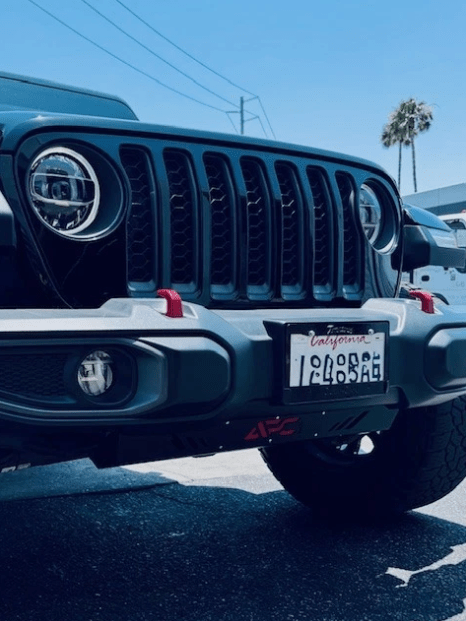 APC21 Black With Red Emblem Custom Skid Plate, Compatible With Jeep Gladiator 2020-2025 & Wrangler 2018-2025. This Product Is Made In USA, Quick 30-minutes Installation, Made With Strong 11ga CRS With Texture Powder Coating For High Resistance.